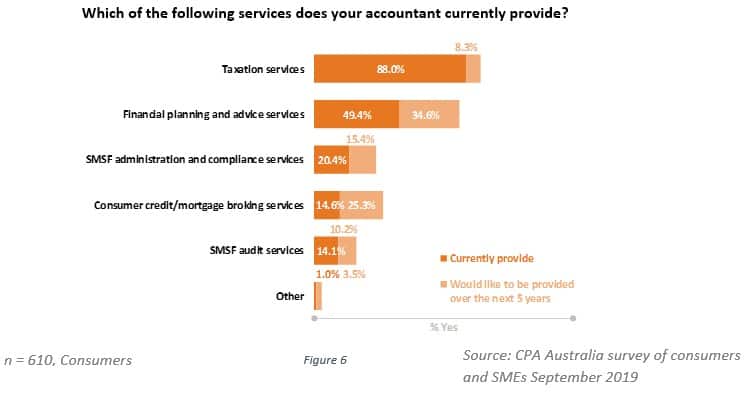 Demand for financial advice is on the rise, and it may be accountants who move to satisfy it. A report published by CPA Australia (in conjunction with CoreData), My Firm. My Future., reveals that two in five (38.3 per cent) small and medium-sized businesses currently receive financial advice from their accountant, and a further one in four (24.9 per cent) would like financial advice to be provided by their accountant within five years. Around half (49.4 per cent) of consumers who have a relationship with an accountant already receive financial planning and advice services from their accountant, and about one in three (34.6 per cent) would like their accountant to provide financial planning and advice services within the next five years. Accountants are often spoken of as being a source of new financial advice capacity, and demand for the service from existing clients underlines this.