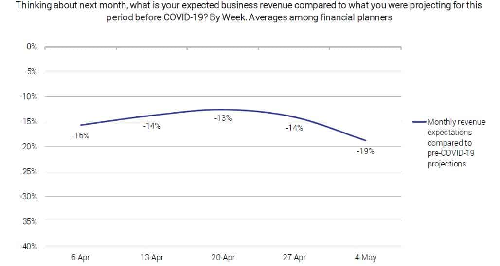 The expected monthly hit to revenue among advice practices is trending up, with an ongoing survey conducted by researcher Investment Trends in partnership with Professional Planner showing planners on average expect revenue to fall by 19 per cent in the month ahead – the highest projected decline since the crisis hit.