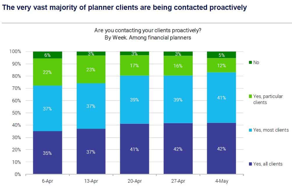 On the client side, Blomfield observes that while only 42 per cent of advisers have proactively contacted every one of their clients since the start of the crisis, 83 per cent have contacted ‘most’ of them. Both these numbers have been trending up since early April when the number reporting they had contacted all clients was at 35 per cent, and the number who had contacted most was at 72 per cent.