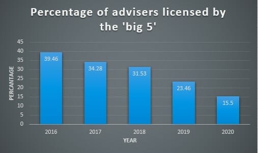 Recent data from the Professional Planner 2020 Licensee Owners List shows the percentage of advisers licensed by the traditional ‘big five’ (CBA, ANZ, Westpac, NAB and AMP) shrinking from around 40 per cent to 15 per cent over the last five years.