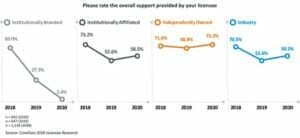 Overall satisfaction with licensee support rebounded in 2020, after taking a big dip in 2019. It hasn’t returned to levels we saw in 2018, but it’s on its way – and the 2021 Licensee Research will show us where the number settles this year.