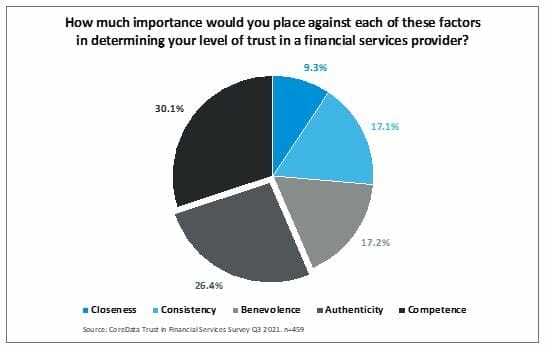 When we ask consumers about their trust in financial services providers, we first ask them how they rank three important elements of trust: authenticity, benevolence, competency, consistency and closeness.