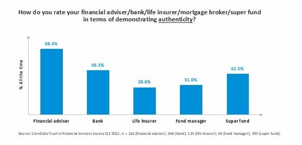 We find that consumers of financial advice rate their financial adviser much higher for demonstrating authenticity than consumers rate their banking, superannuation, life insurance, fund management and mortgage broking services. And this has a significant impact on how much consumers of financial advice trust their financial adviser.