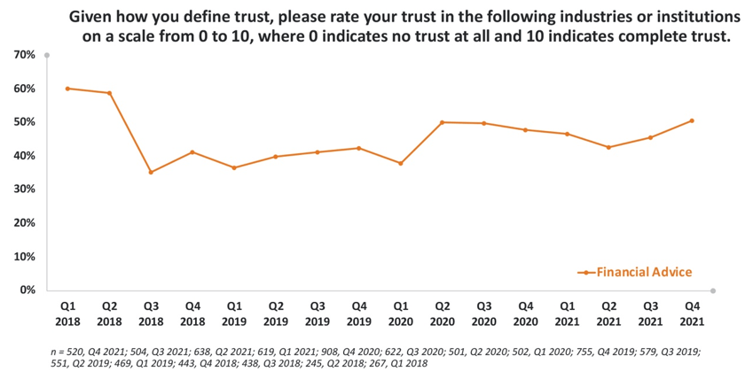 The first two points on the chart above show public trust in financial advice before the Royal Commission held its public hearings into financial advice, and how it plunged immediately afterwards. From Q3 2018 and until Q4 2021 the index only reached a value of 50 on two occasions, in Q2 and Q3 of 2020.
