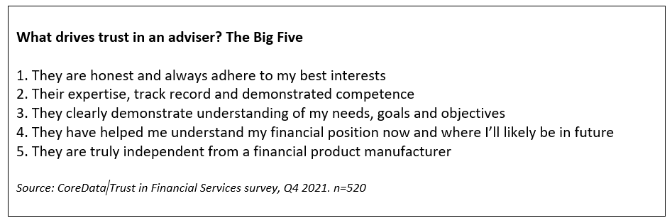 What we do know, though, is that there are a few factors that crop up consistently when we ask clients to tell us that financial advisers do that makes clients trust them.