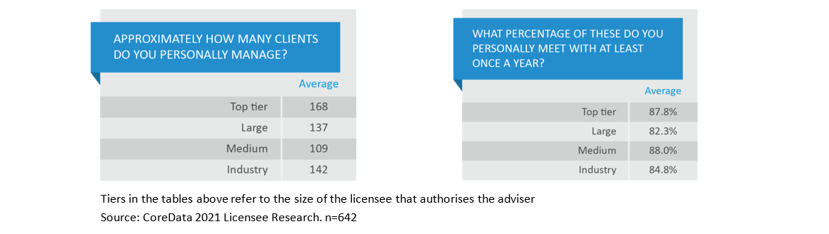 CoreData research shows consistently that the average number of clients per adviser is something in the order of about 140. That’s supported anecdotally in conversations with licensees, who tell us that in cases where the figure is materially higher than this, advisers are actively taking steps to cut numbers back.