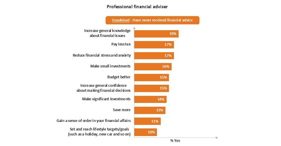 That means around seven times as many people say they trust information and advice from advisers as say they trust it from social media. Around one in five (19 per cent) of consumers who’ve never received advice before say they’d trust a professional financial adviser to help them with financial issues, and these are often more complex issues than consumers would turn to social media for help with. They include paying less tax, increasing confidence about making financial decisions, making investments, reducing stress and anxiety, and increasing their general knowledge about financial issues.