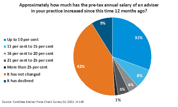 CoreData’s latest Adviser Pulse Check survey has found that overall, 42 per cent of advisers have experienced no change in salary and 9 per cent have experienced a fall; while three in 10 (31 per cent) have experienced an increase of less than 10 per cent.