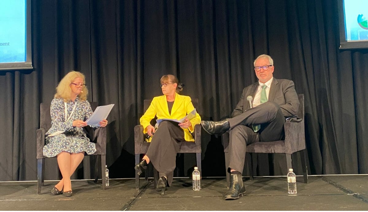 Moderator Judith Fox (left) with speakers Sarah Derrington and Andrew Inwood.