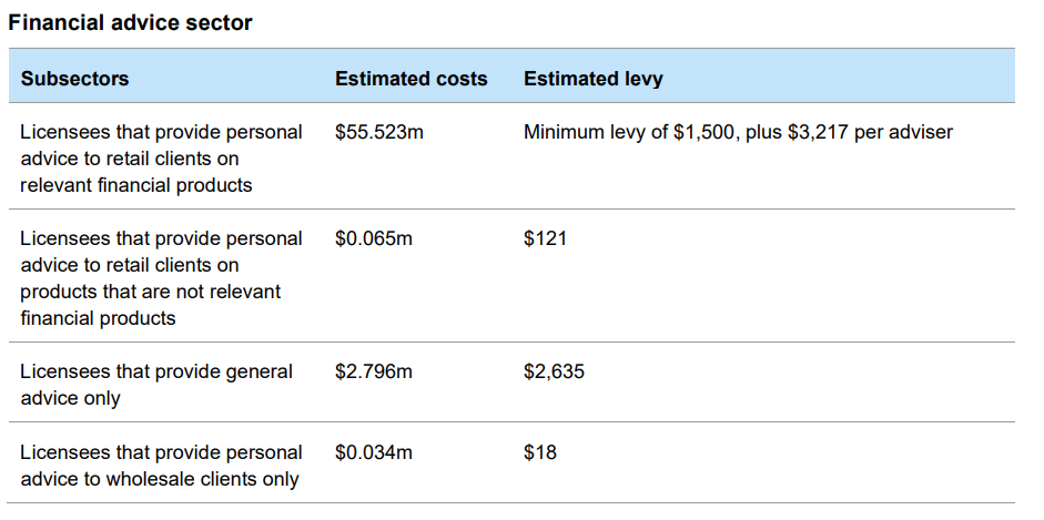 The total cost to regulate the financial advice sector is $58.42 million, which is broken down in the table below. The figure included $50.02 million for cost recovery and $8.3 million for statutory levies. The  estimated cost of retail holistic advice covered by the levy totaled $55.23 million.