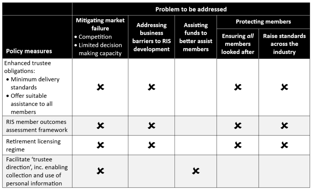 The table below summarises the problems outlined above and the policy measures we propose along the theme of ensuring that super funds are effective agents that act to benefit their retired members while leaving no members behind. The broad thrust is to (a) place clear obligations on trustees who operate a RIS in terms of service delivery, (b) provide an opt-out for those funds who cannot justify the business case, and (c) empower funds to assist all members into appropriate retirement solutions.
