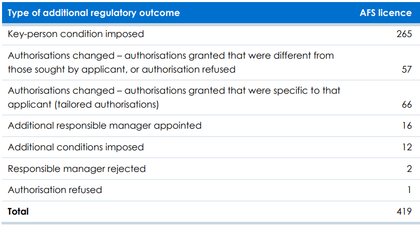 Some 48 per cent of approved AFSL applications were subject to at least one additional “regulatory outcome” with 419 additional regulatory outcomes achieved on approved applications.