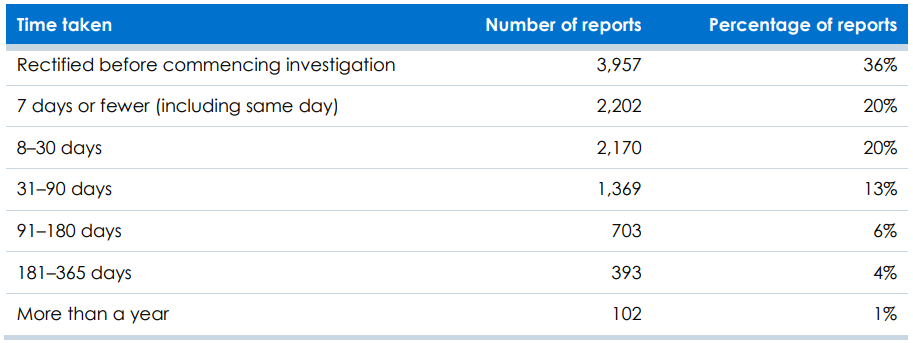 “However, there were 102 reports where licensees took, or were expected to take, more than a year to completely rectify the breach after commencing their investigation. Licensees should rectify breaches effectively and within a reasonable timeframe to minimise further harm to customers.”