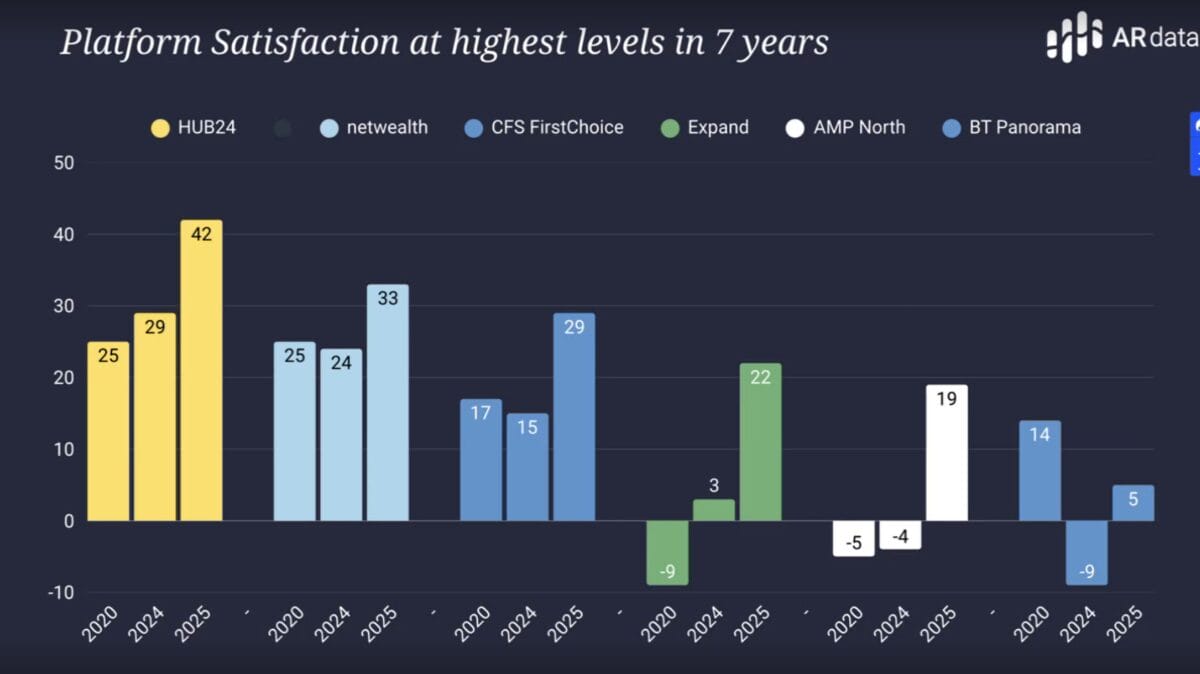 The biggest players in the platform space HUB24 and Netwealth had a 2025 net promoter score of 42 and 33 respectively. This is an increase from 25 for both in 2020.