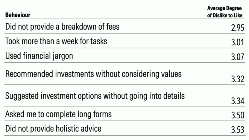 Based on a survey of 400 households with an active adviser relationship, respondents rated on a scale of one to seven how much a particular adviser behaviour “irritated” them.