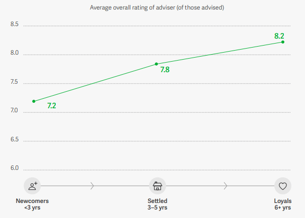 The research placed clients into three categories based on tenure: “newcomers”, where the relationship had existed for less than three years; “settled” which covered three to five years; and “loyals” who had been with the adviser for six years and over.