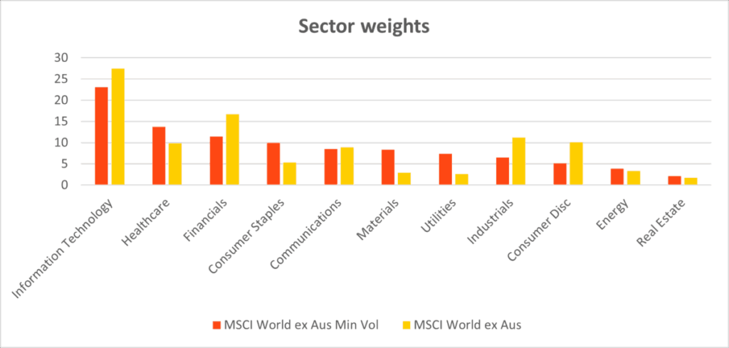 A key feature of the Minimum Volatility Index is that it’s constructed to have broadly similar sector weights to a traditional global equity passive exposure. As seen in the chart below, this prevents overweights into traditional safe haven sectors, allowing the index to achieve similar returns to broad global equities over time while smoothing out volatility.